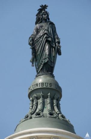 *The image of the Statue of Freedom, or “Freedom Triumphant in War and Peace”, the crown jewel on top of the United States Capitol Building. The helmet design is basically an adapted Roman military helmet, with stars across the brow, and an eagle and feathers on top in the umbrella or mohawk style pictured.